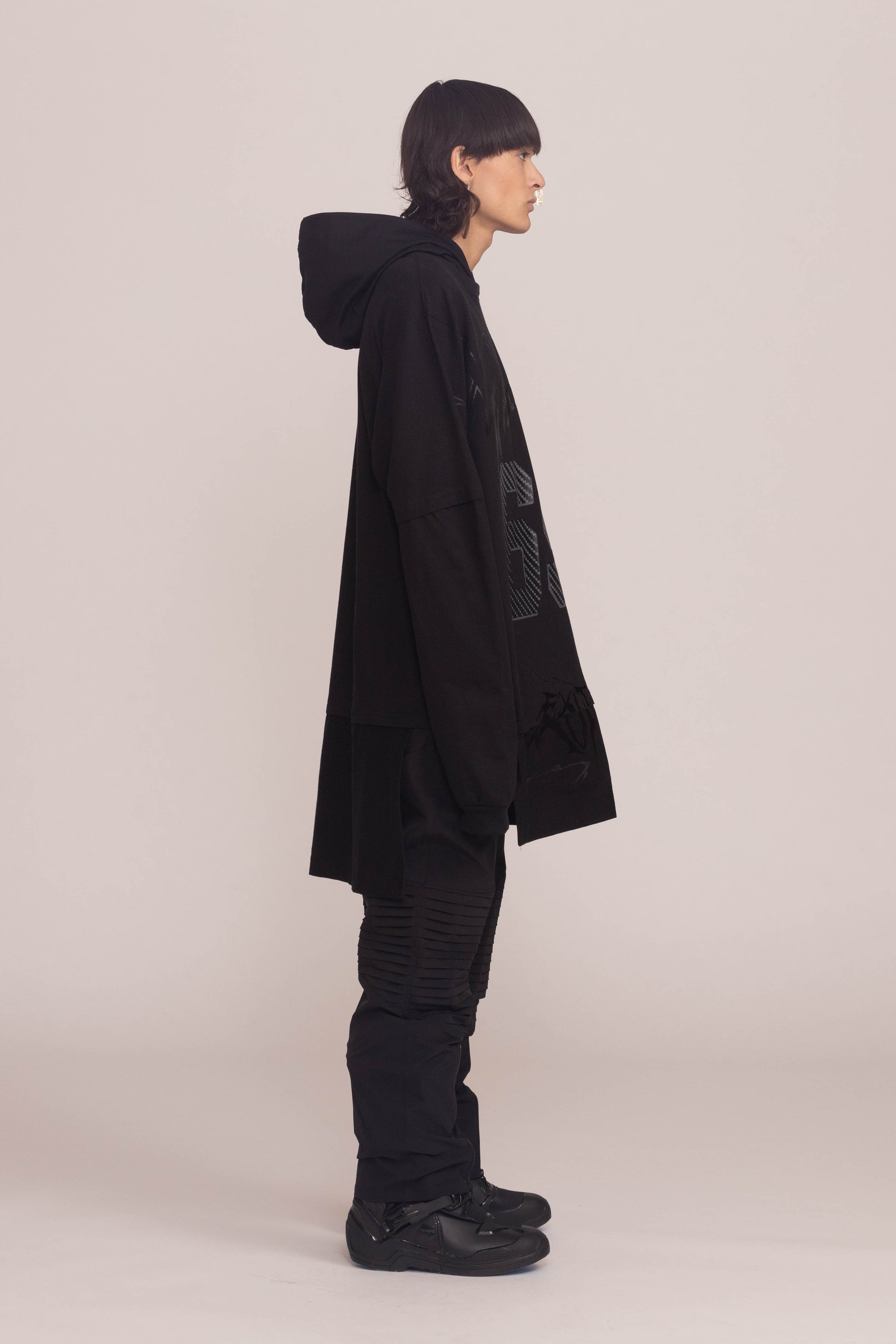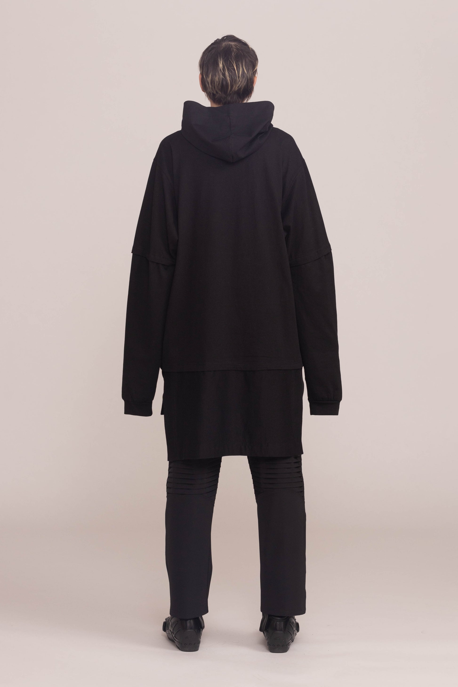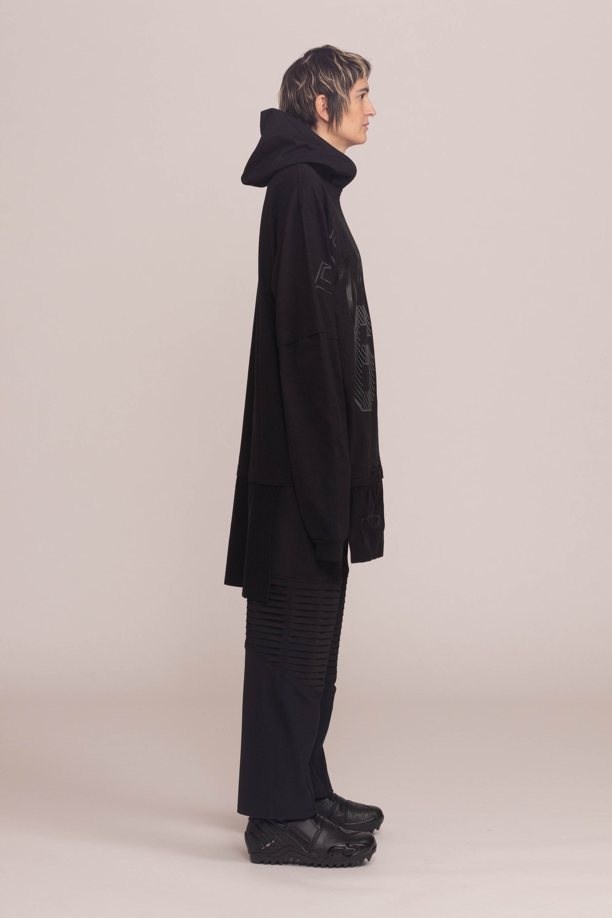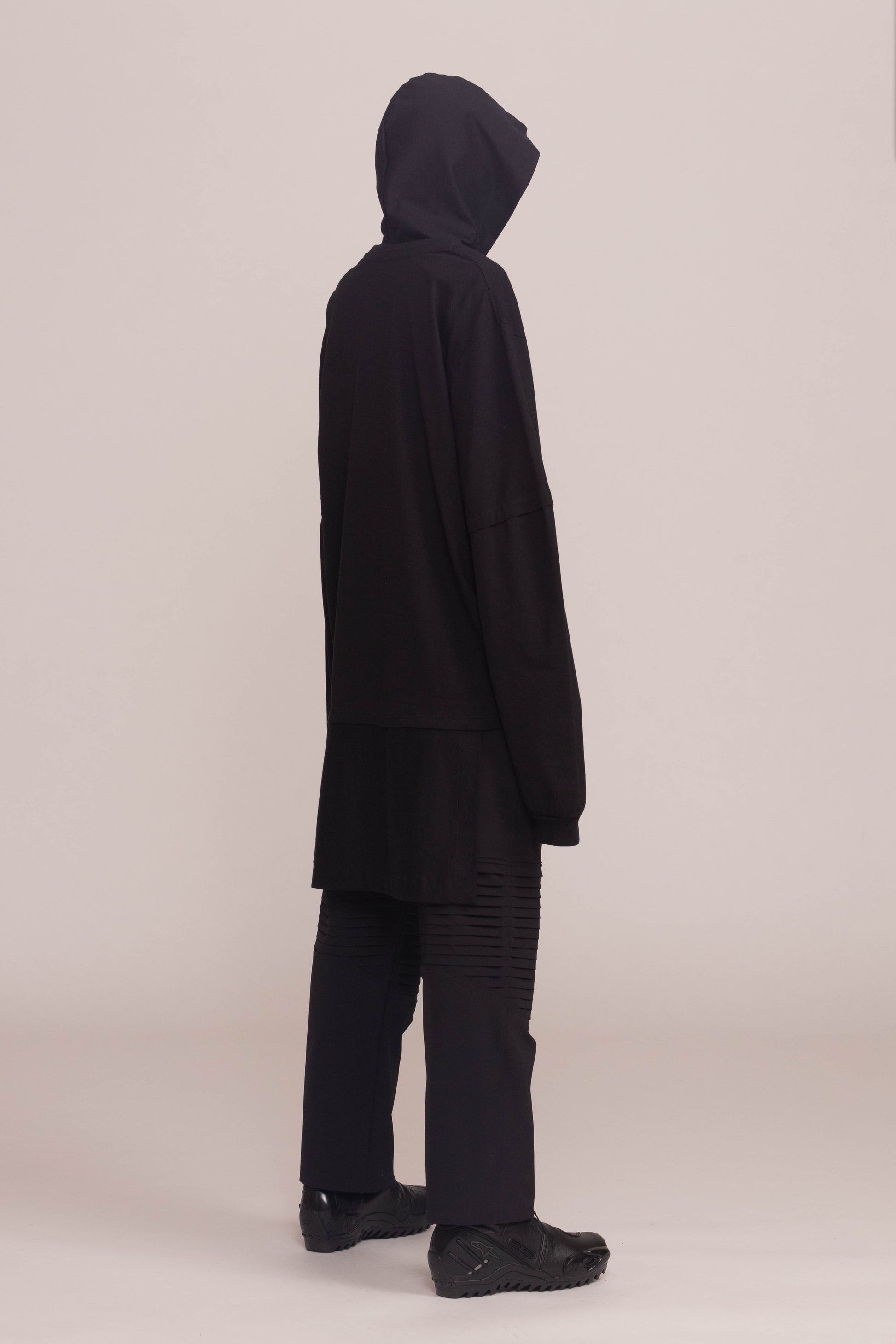 This black shirt is cut to a relaxed fit. It drops dramatically at the shoulders and hangs low at the hem with oversized sleeves and a cocooning hood.