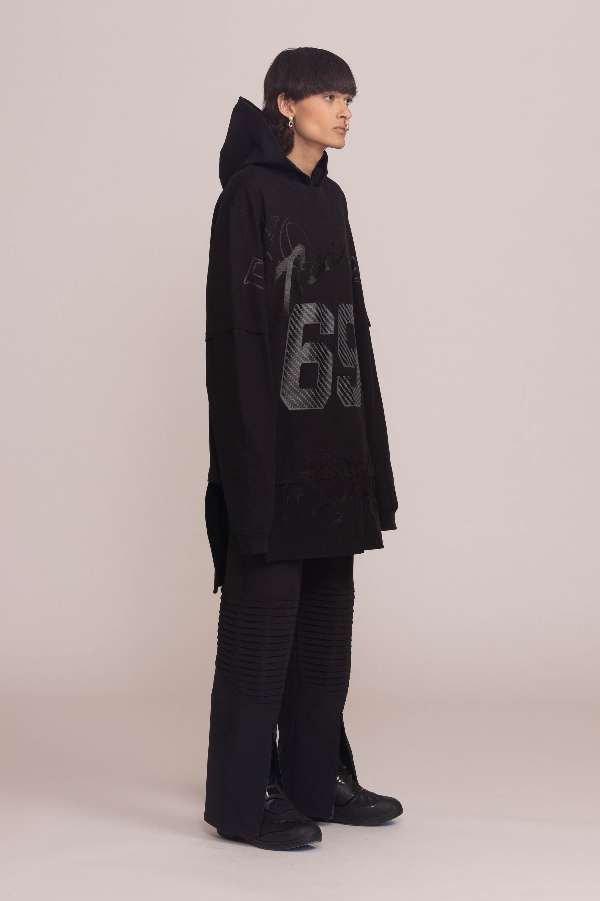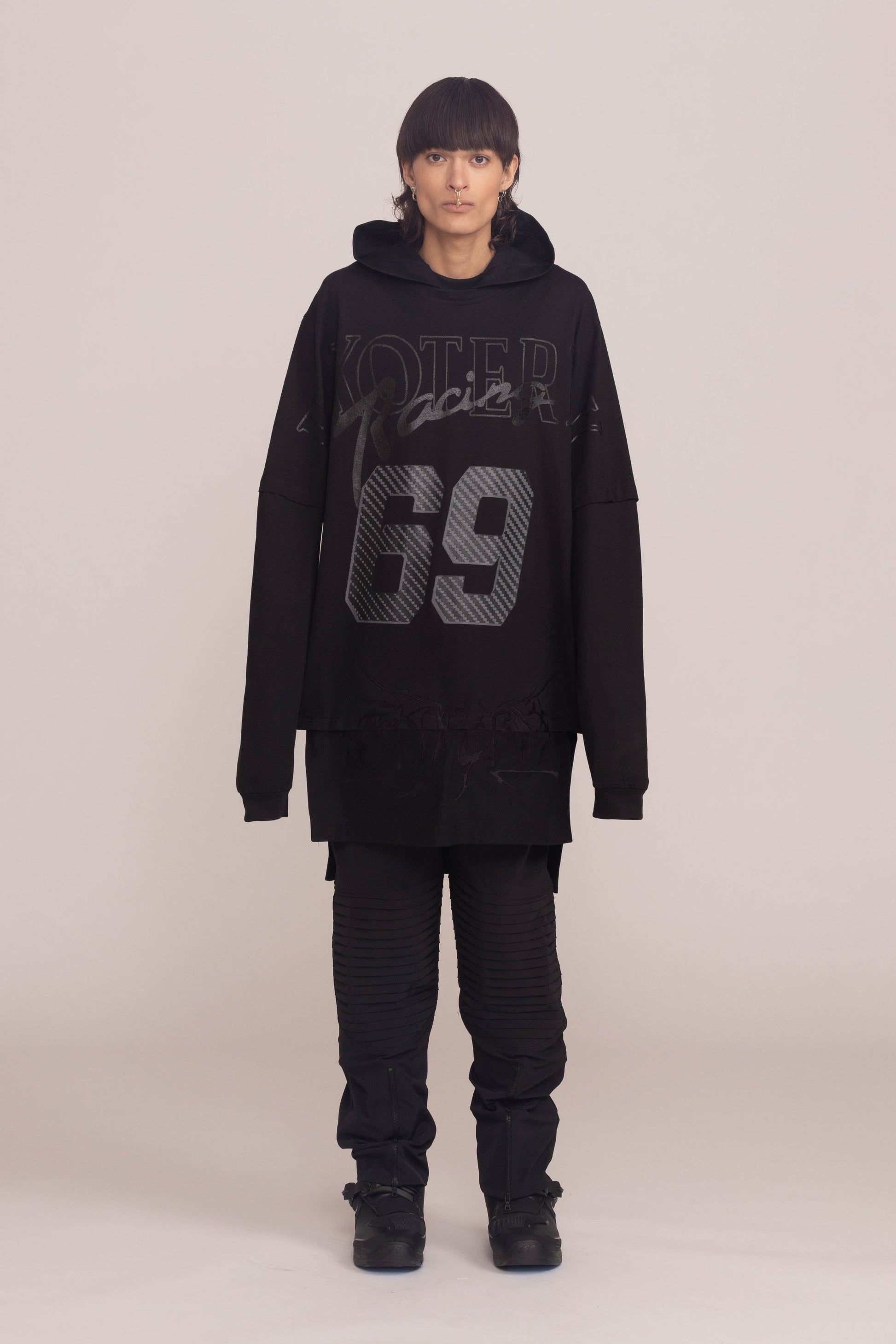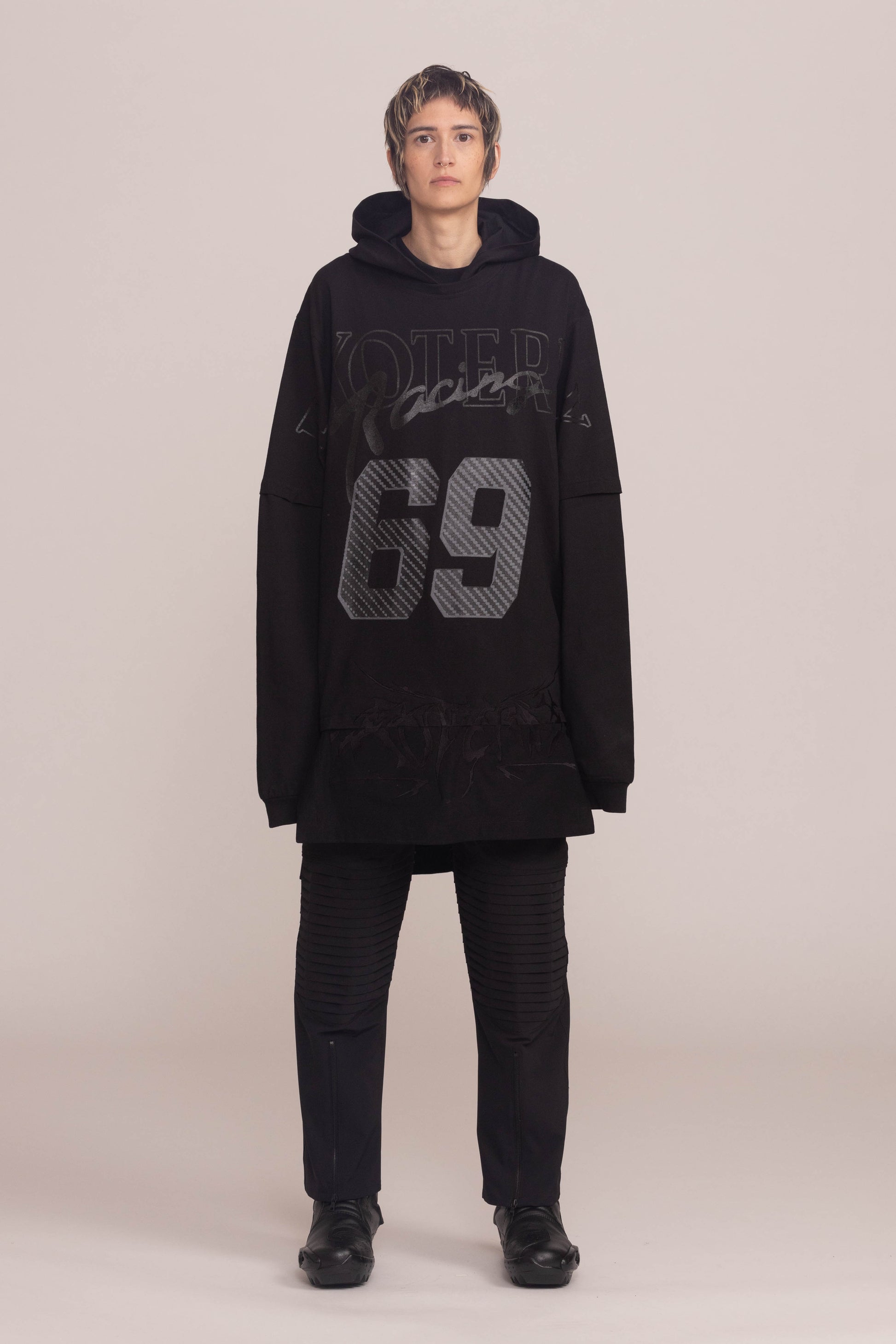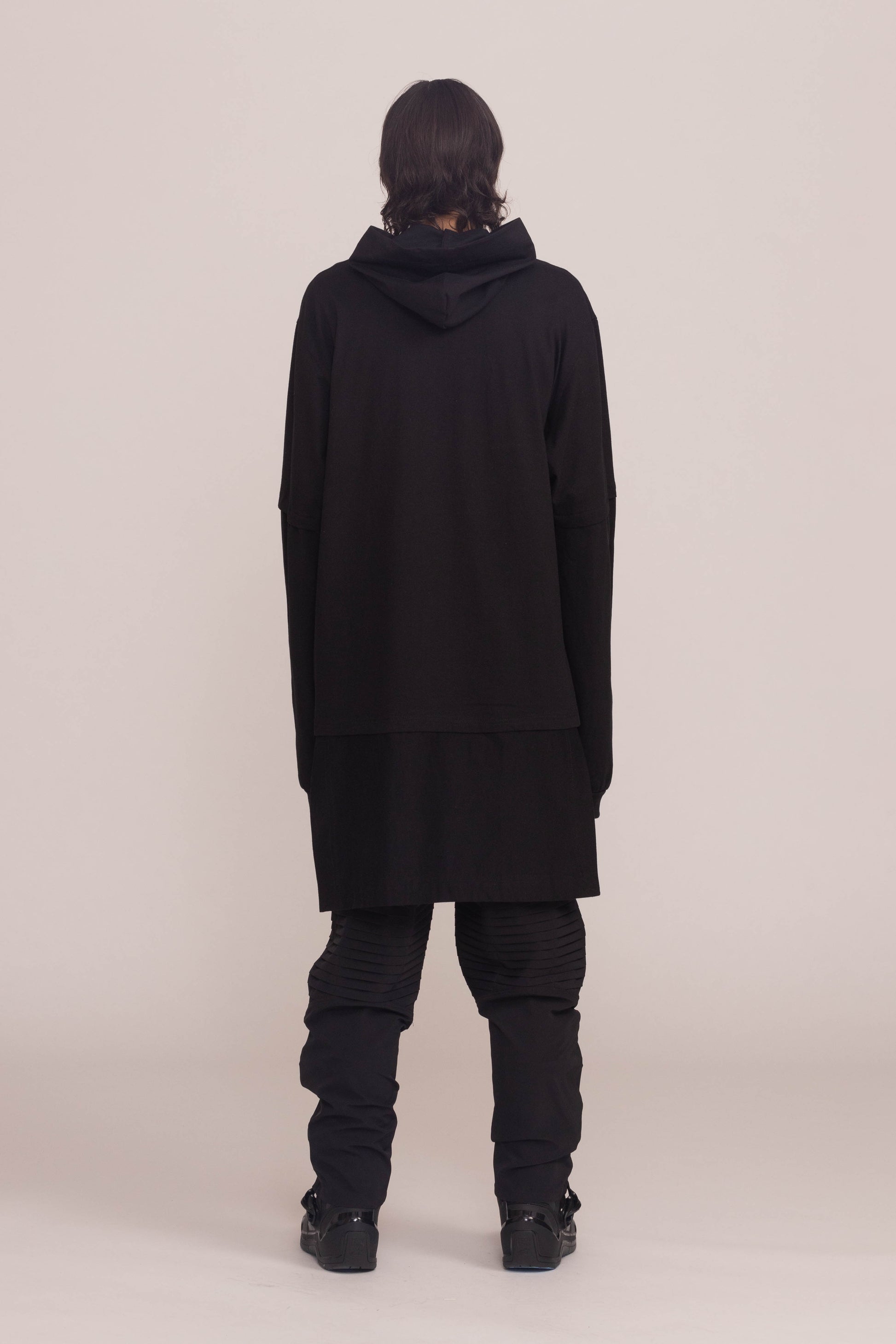 This black shirt is cut to a relaxed fit. It drops dramatically at the shoulders and hangs low at the hem with oversized sleeves and a cocooning hood.